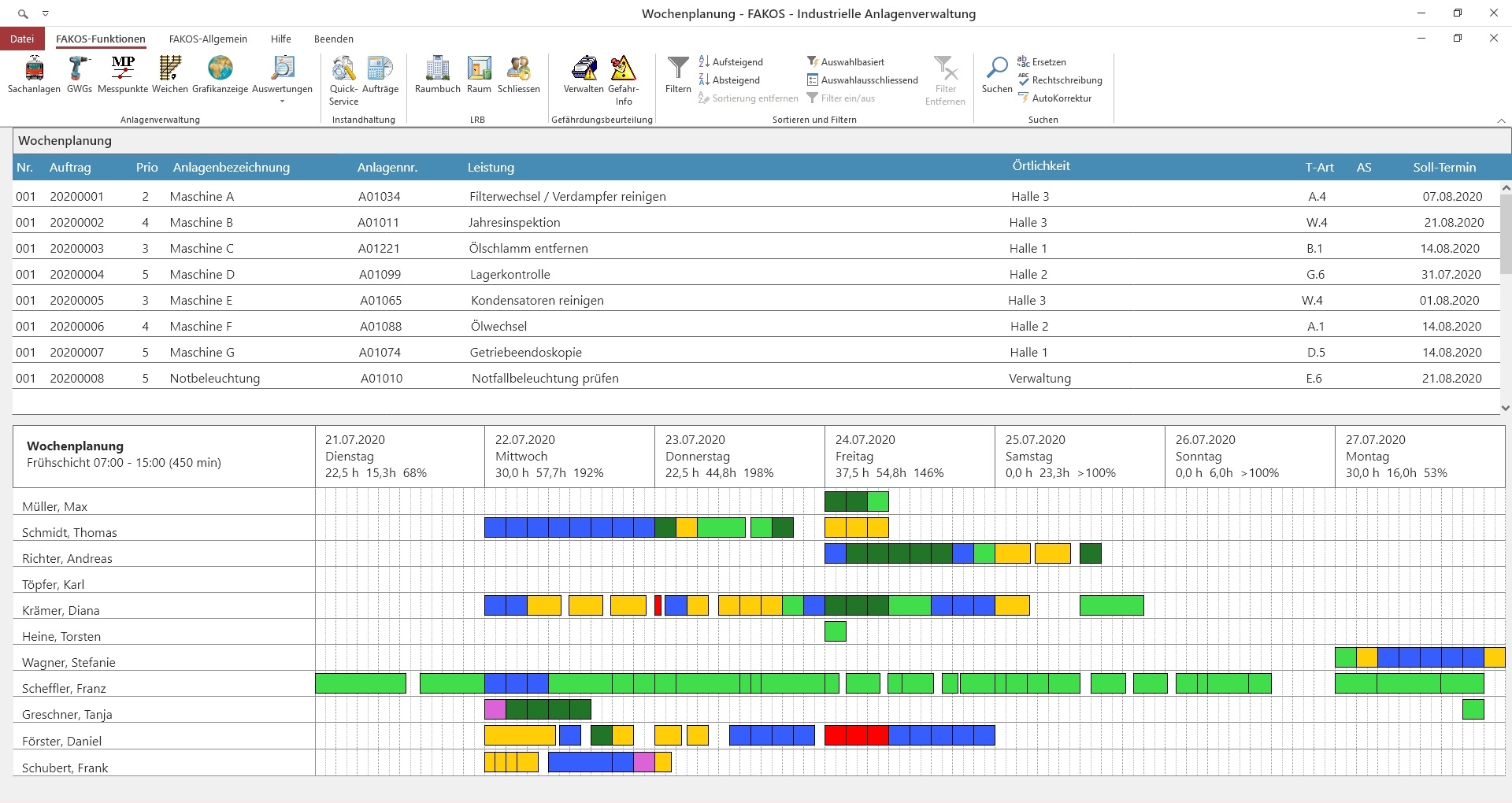 Die FAKOS Wartungssoftware bietet ein umfangreiches Modul zur Personalplanung. Somit haben Sie auf einen Blick, welcher Mitarbeiter für welche Aufgaben eingeplant ist. Mehr noch: Sie planen einzelne Aufträge und Schichtarbeiten. Je nach den hinterlegten Qualifikationen in den Stammdaten der Mitarbeiter können die Aufträge zugeordnet oder sogar Ausbildungsbedarfe abgebildet werden.